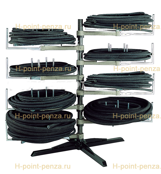 Он удобен при частом использовании рукавов разных диаметров и используется в сервисных мастерских, где производится разноплановая продукция. Данный держатель для рукавов позволяет одновременно хранить до 8 бухт рукавов высокого давления, с максимальной нагрузкой на одну полку 240 кг. Рукава могут храниться без картонных или пластиковых втулок. Конструкция удобна в эксплуатации, каждый рукав подается к отрезной машине через специальное кольцо.